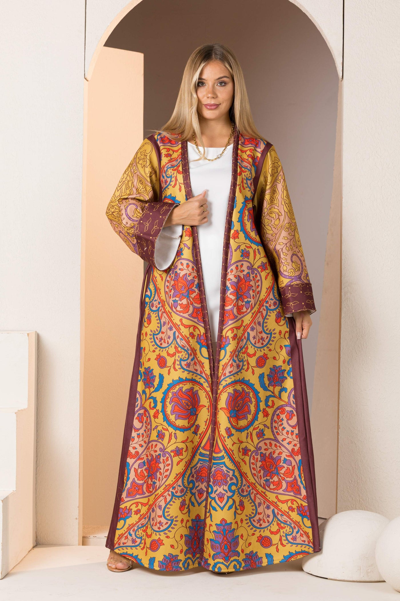 Product Details This kaftan features a luxurious motifs inspired by traditional Middle Eastern patterns. The design includes elegant floral elements...
